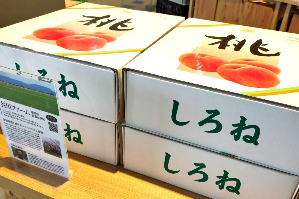 やまきん果樹園さん(加茂市)や谷川ファームさん(新潟市南区)の化粧箱入りの桃も、数量限定で入荷しております。