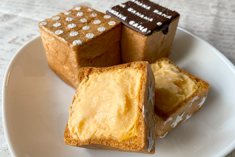 一つずつ丁寧に手作りしている四角いシュークリームなどのスイーツを