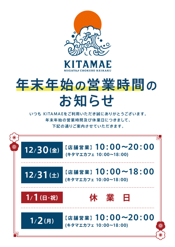 年末年始の営業時間及び休業日につきまして、 下記の通りご案内させていただきます。