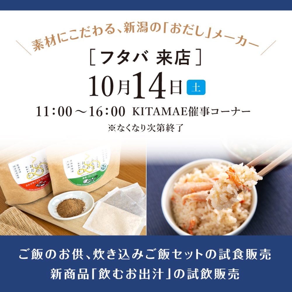 炊き込みご飯セットや、新商品「だしカフェタイム」の試食・試飲販売、その他ご飯のお供の販売で、フタバさんが来店します。