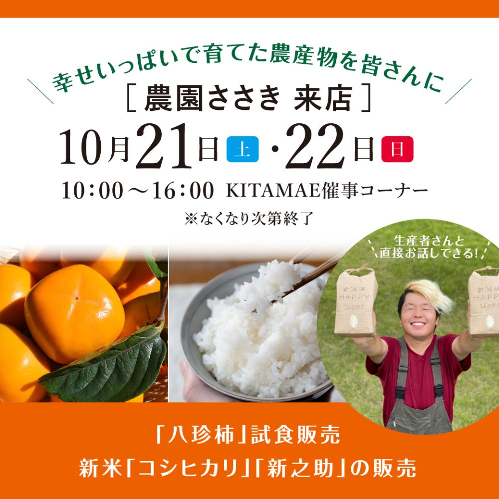 新潟市秋葉区より、「八珍柿」の試食販売や、新米「コシヒカリ」「新之助」などの販売で、農園ささきさんが来店します。魚介類のミネラルなどを使った良質な土づくりにこだわる農家さんです。直接お話しもできます!