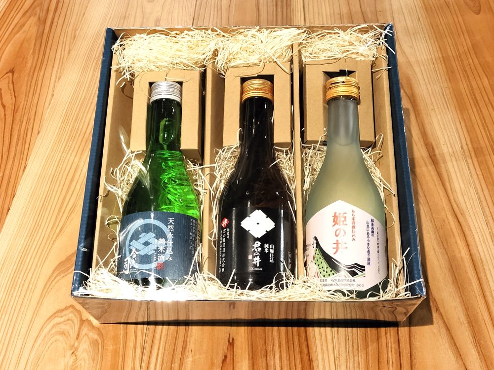 味わいが異なるおすすめの日本酒3種類をセットにしました。