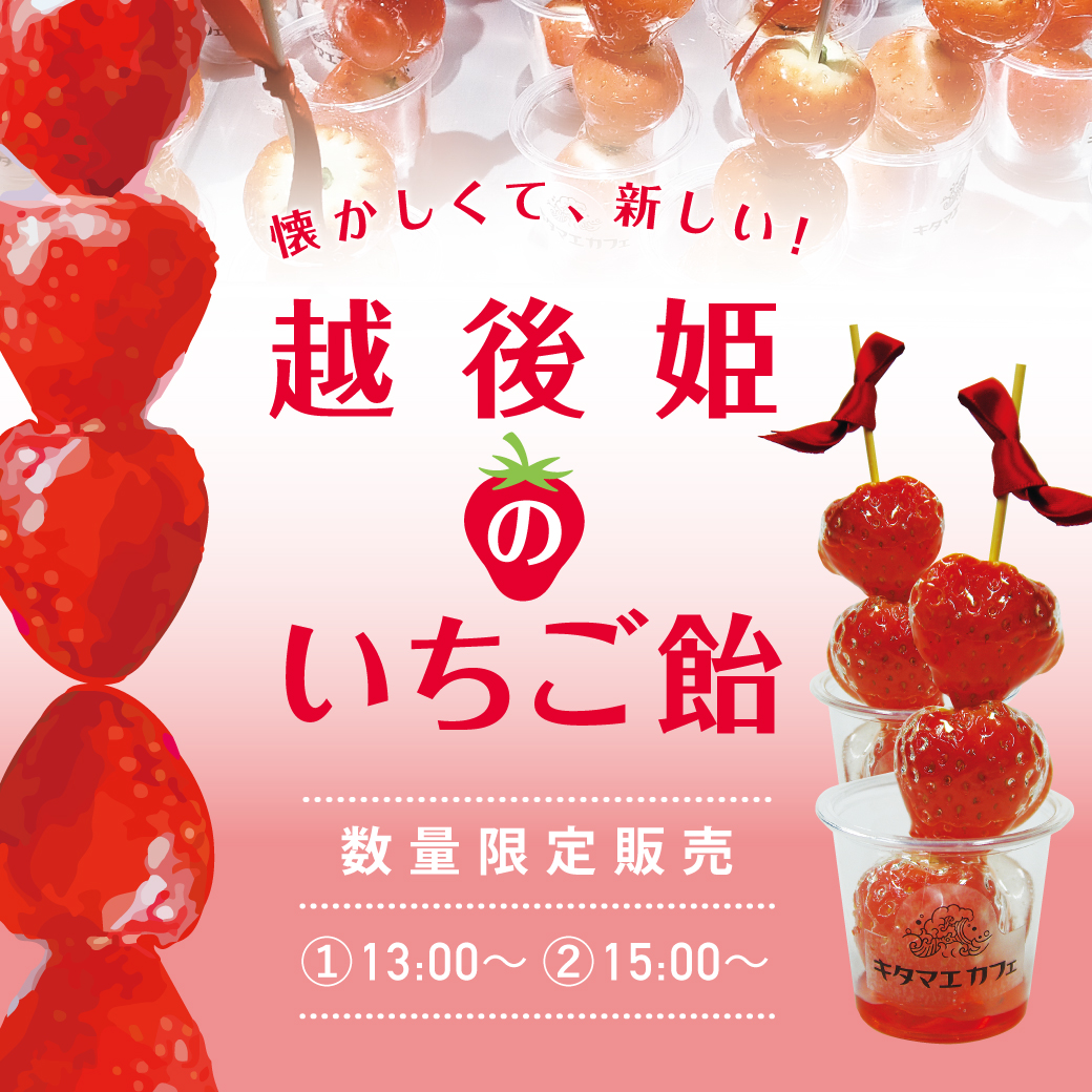 毎年好評の、新潟県産の越後姫を使った「いちご飴」を数量限定で販売します!
